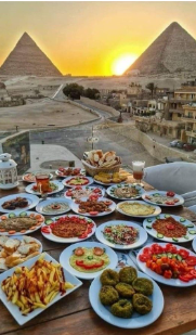 La cuisine égyptienne est généreuse, parfumée et variée. Elle repose sur des ingrédients simples tels que le riz, les légumes, les pois chiches et les viandes grillées. Parmi les spécialités incontournables, on trouve le koshari, mélange de riz, lentilles et pâtes, garni d’oignons frits, le ful medames, plat traditionnel de fèves mijotées, et le taameya, équivalent égyptien du falafel. Les brochettes de kebab, le poulet mariné et les poissons grillés sont également très populaires.
