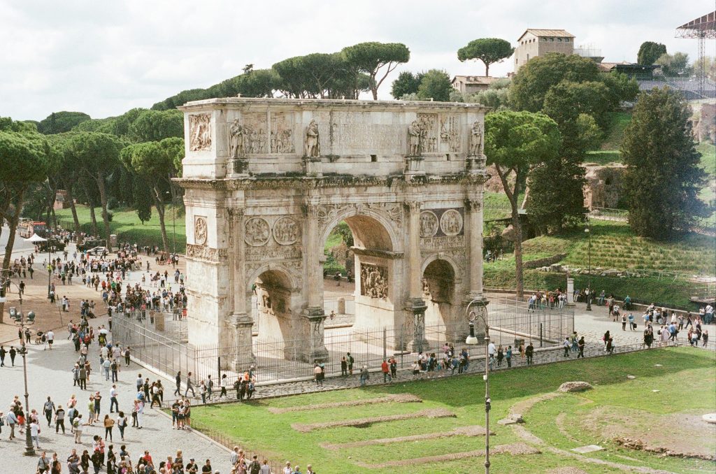L’Arc de Constantin se situe à proximité du Colisée et fut érigé en 315 après J.-C. pour célébrer la victoire de l’empereur Constantin. Cet arc de triomphe monumental est décoré de sculptures et de reliefs illustrant des scènes militaires et impériales. Il symbolise la tradition romaine de commémorer les grandes victoires par des monuments imposants destinés à glorifier les empereurs et à affirmer leur pouvoir.